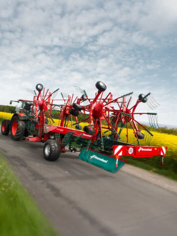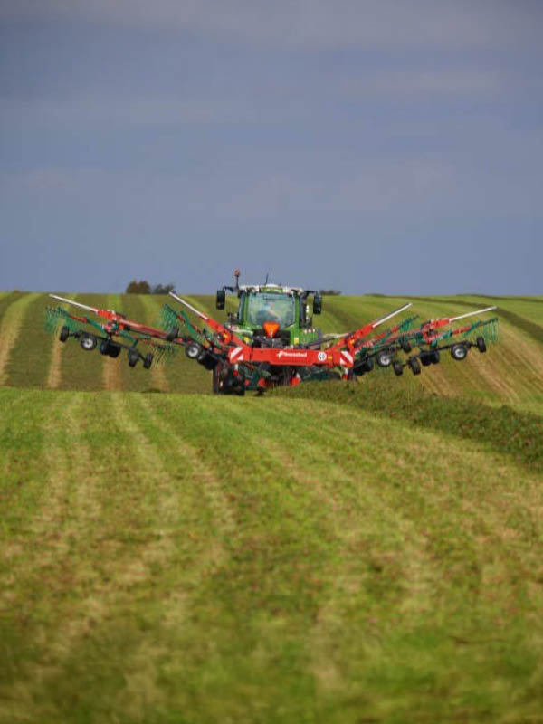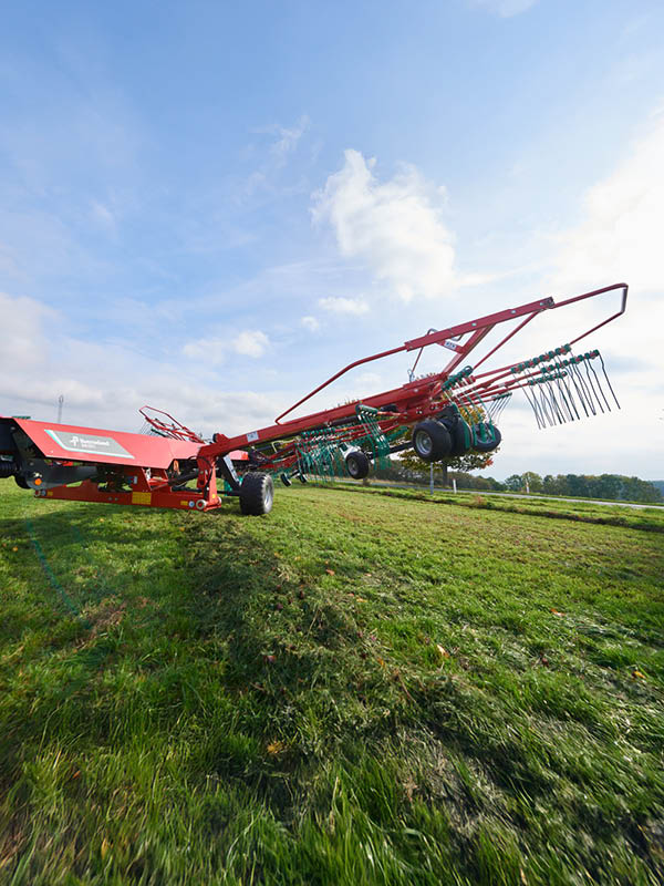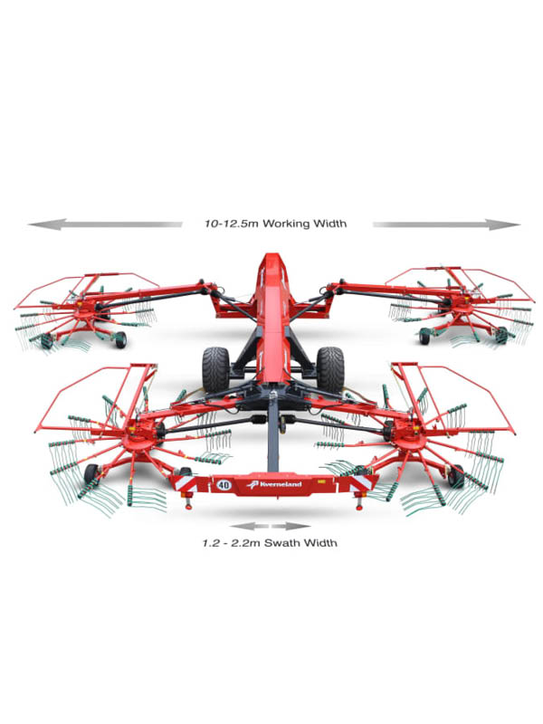 Working width can be adjusted hydraulically between 10.0-12.5m, swath width between 1.2 and 2.2 m, and transport position of less than 4.0m, without removing tine arms. The maintenance-free TerraLink Quattro rotor suspension system secures optimal ground-contour following. All functions can be easily operated with a simple control box.