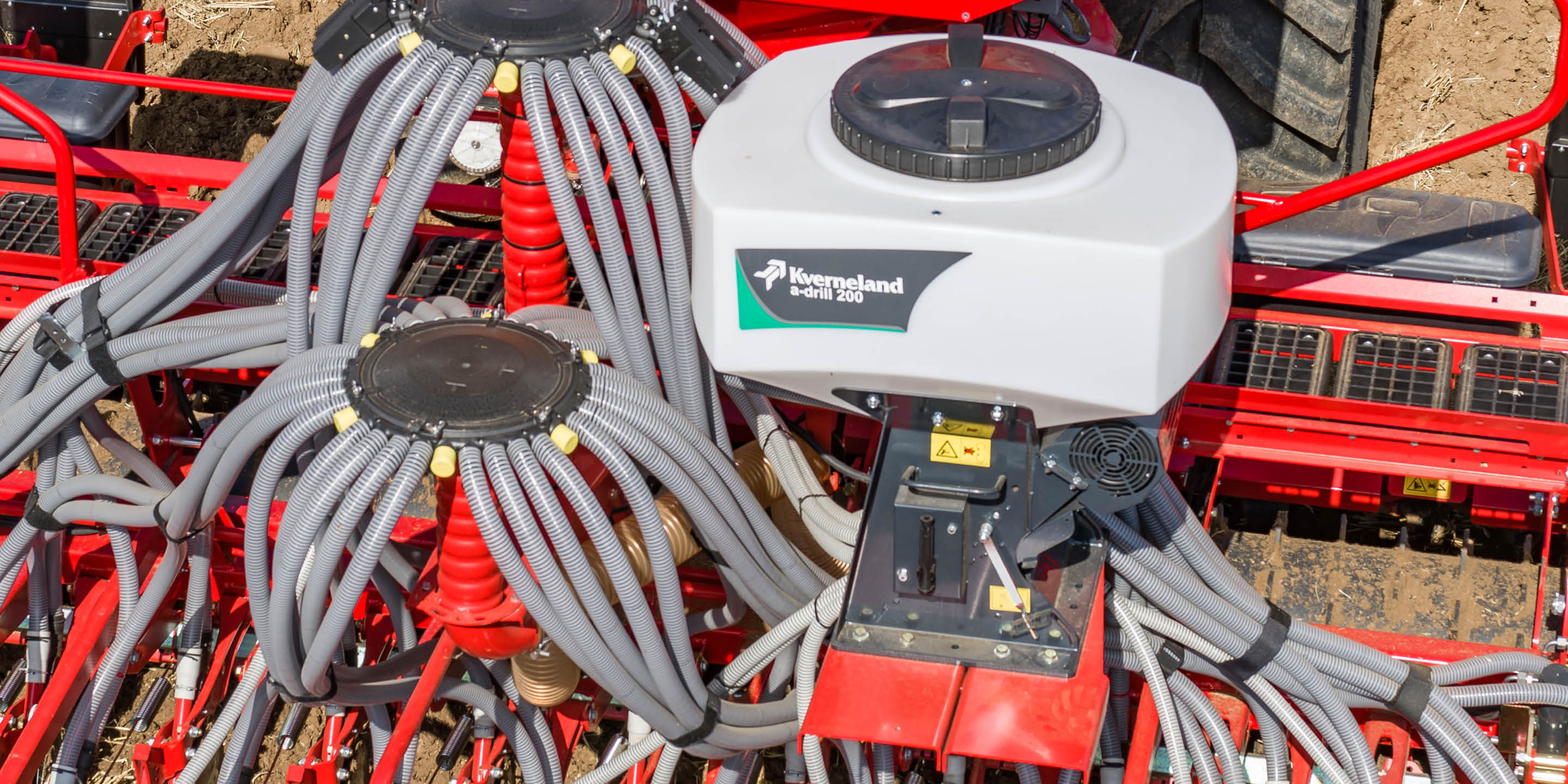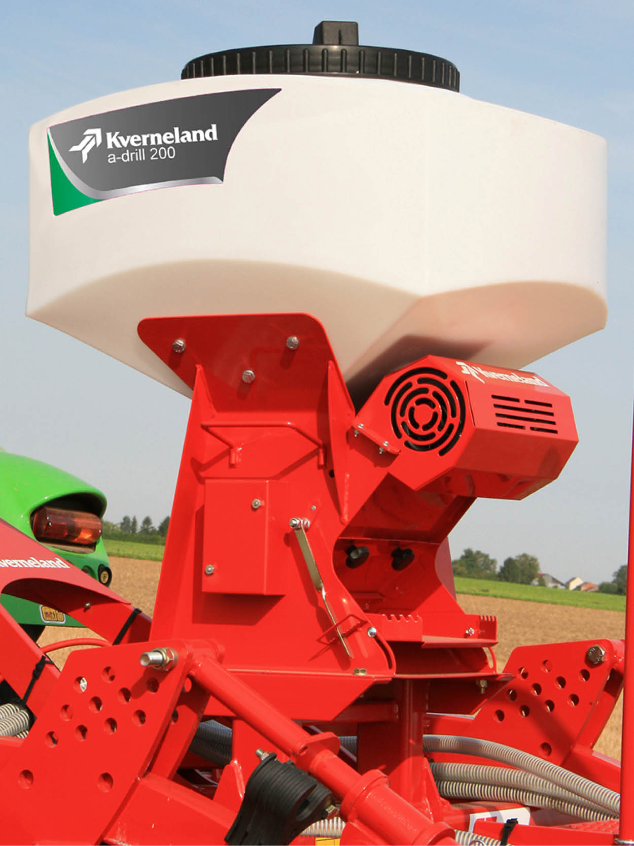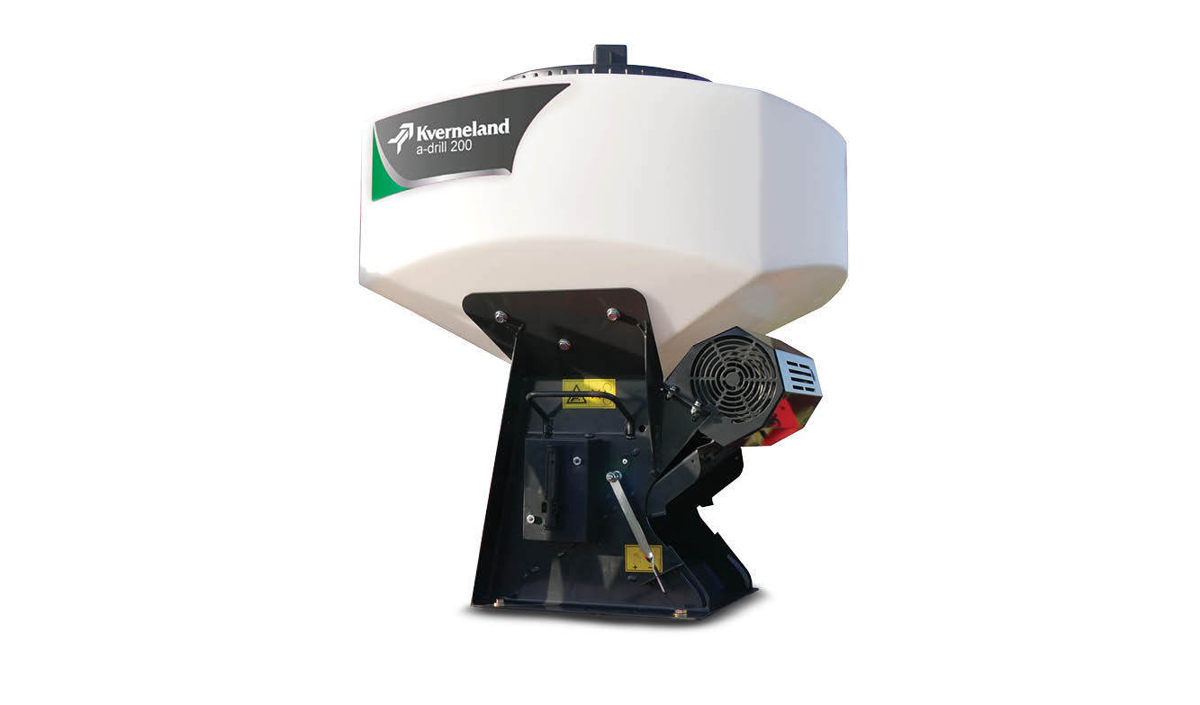 Mounted on the Kverneland e-drill, the a-drill is ready to apply an additional sort of crops or fertiliser. Two models are available:The Kverneland a-drill 200 (200l) for smaller seed rates and the Kverneland a-drill 500 (500l) for higher seed rates (25 to 50kg/ha – mix of seeds, grass, etc.). Both models have 8 outlets which will spread the flow of seeds uniformly over the working width. In addition, they can also be used for establishing rape or a mix of different diameters seeds (leguminous plant, crucifers). The a-drills can be equipped with two types of fan: The electric fan is recommended for rigid machines and fine seeds. It allows seed rates of 4 kg/min. The hydraulic fan is recommended for larger machines, high seed rates and normal seeds. It is prepared for the application of up to 14 kg/min.