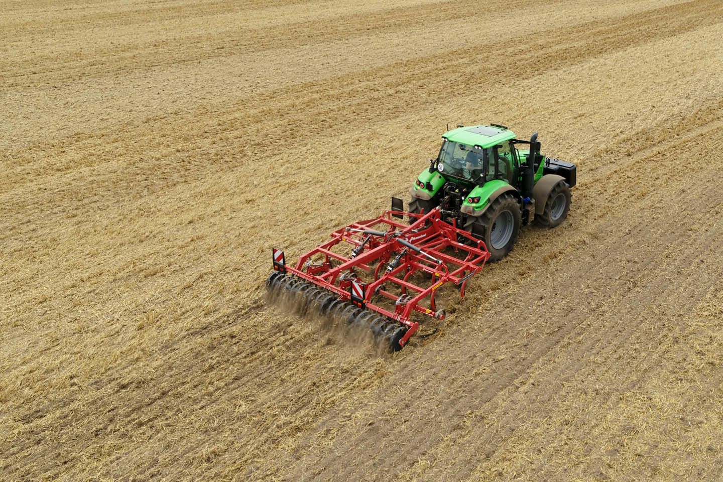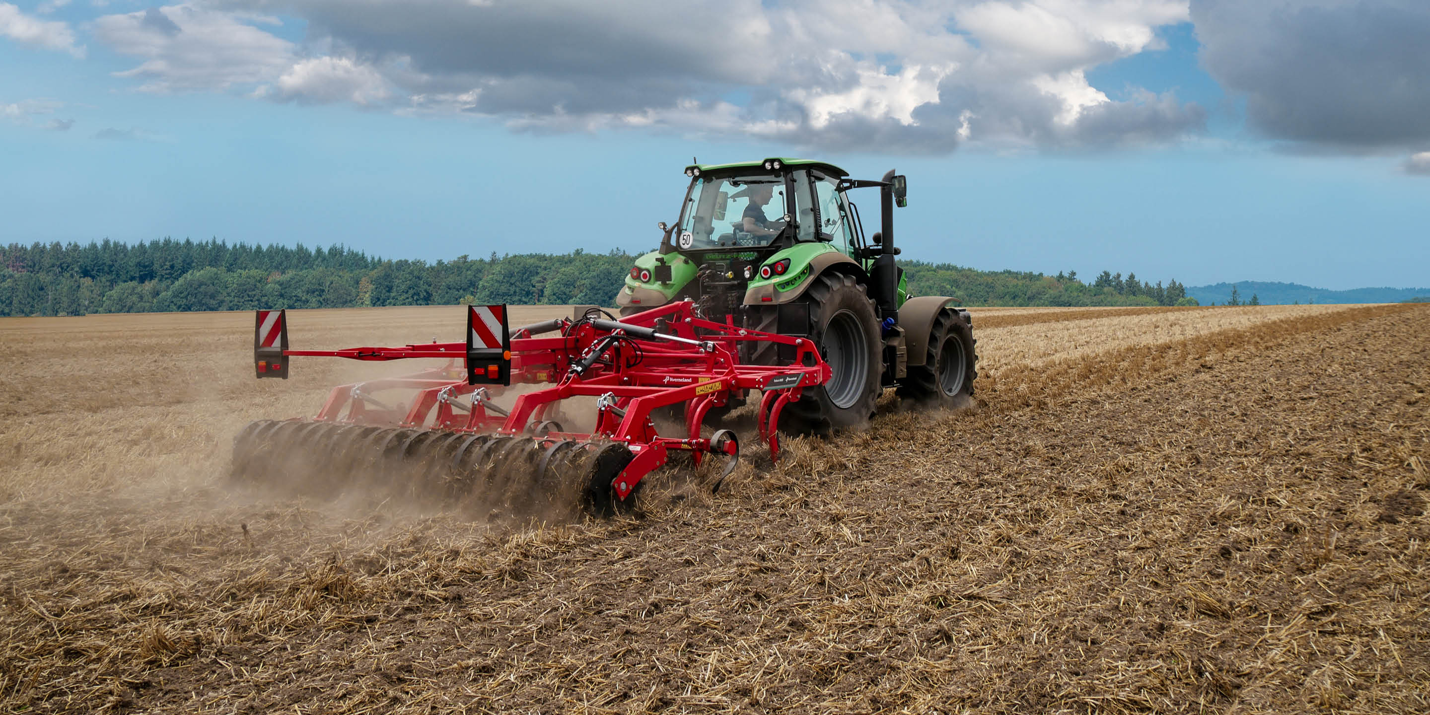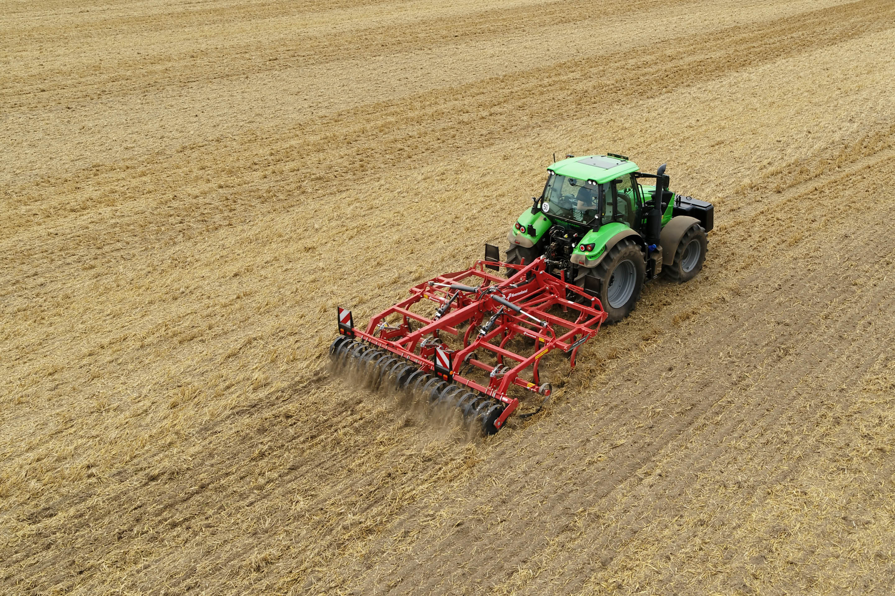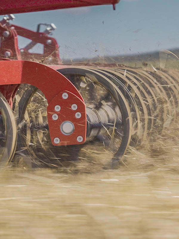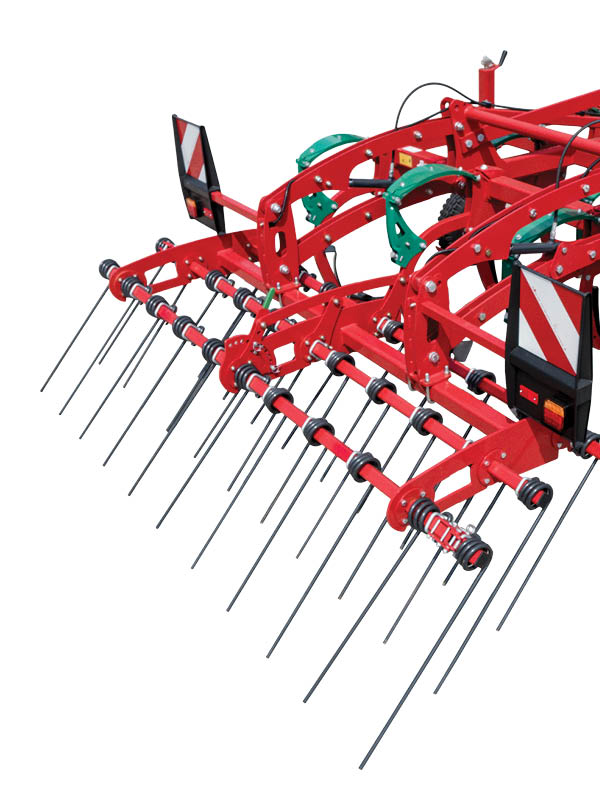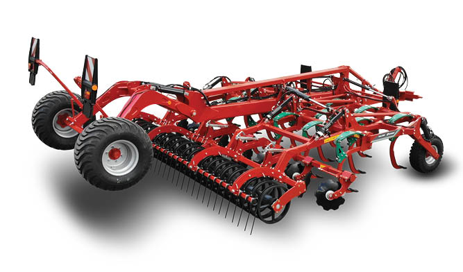 The foldable trailed versions offer working widths from 4.0–5.0 m without requiring high lifting capacity, while gauge wheels and hydraulically adjustable rear rollers ensure consistent ground adaptation and accurate depth control. Equipped with Triflex 700 tines and the Knock-on® system, operators can choose from seven share designs for fast, tool-free changes and quick adaptation between tasks.
