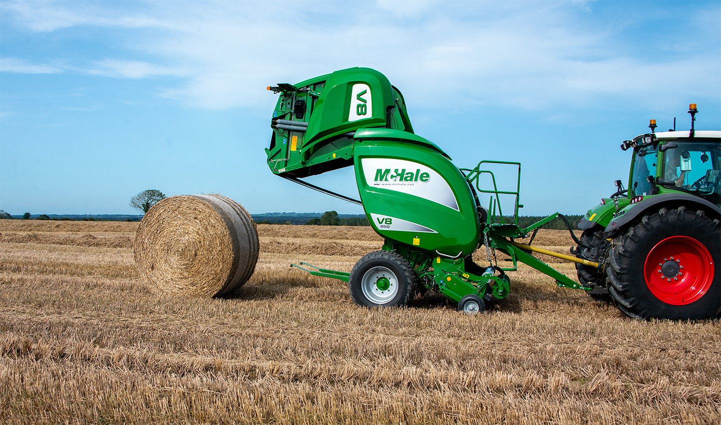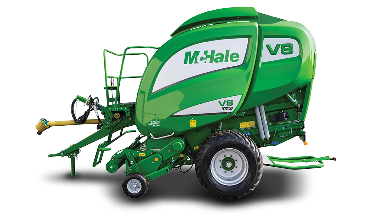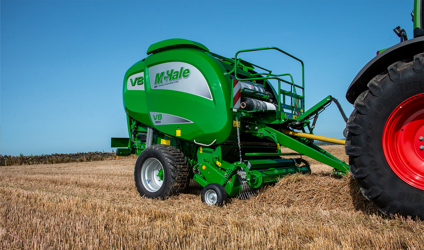 The McHale V8950 is a semi-automatic variable chamber baler which is fitted with a 15 knife chopper unit and heavy-duty rotor. It is equipped with a double drive system which allows the machine to operate in the toughest of conditions.
