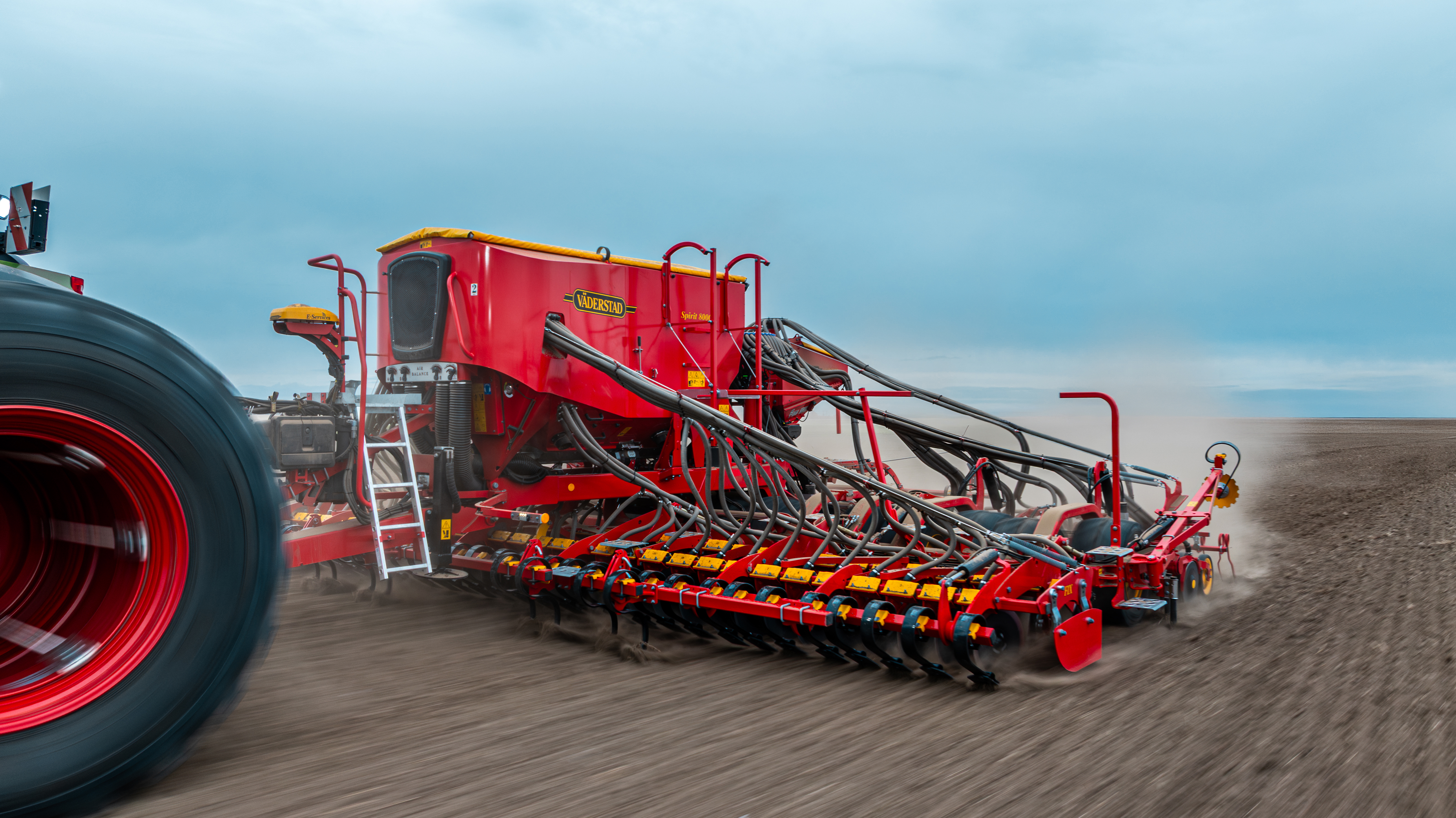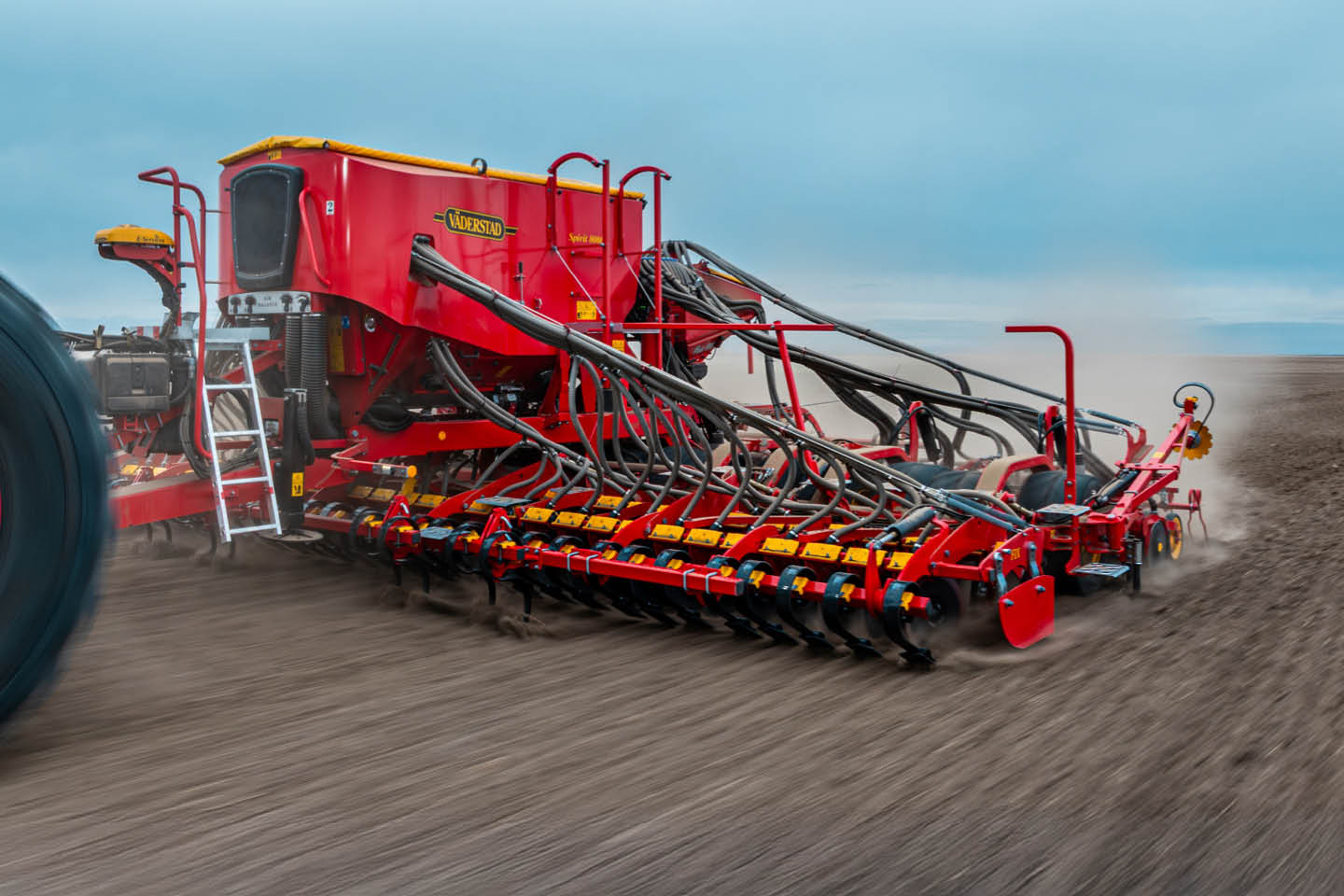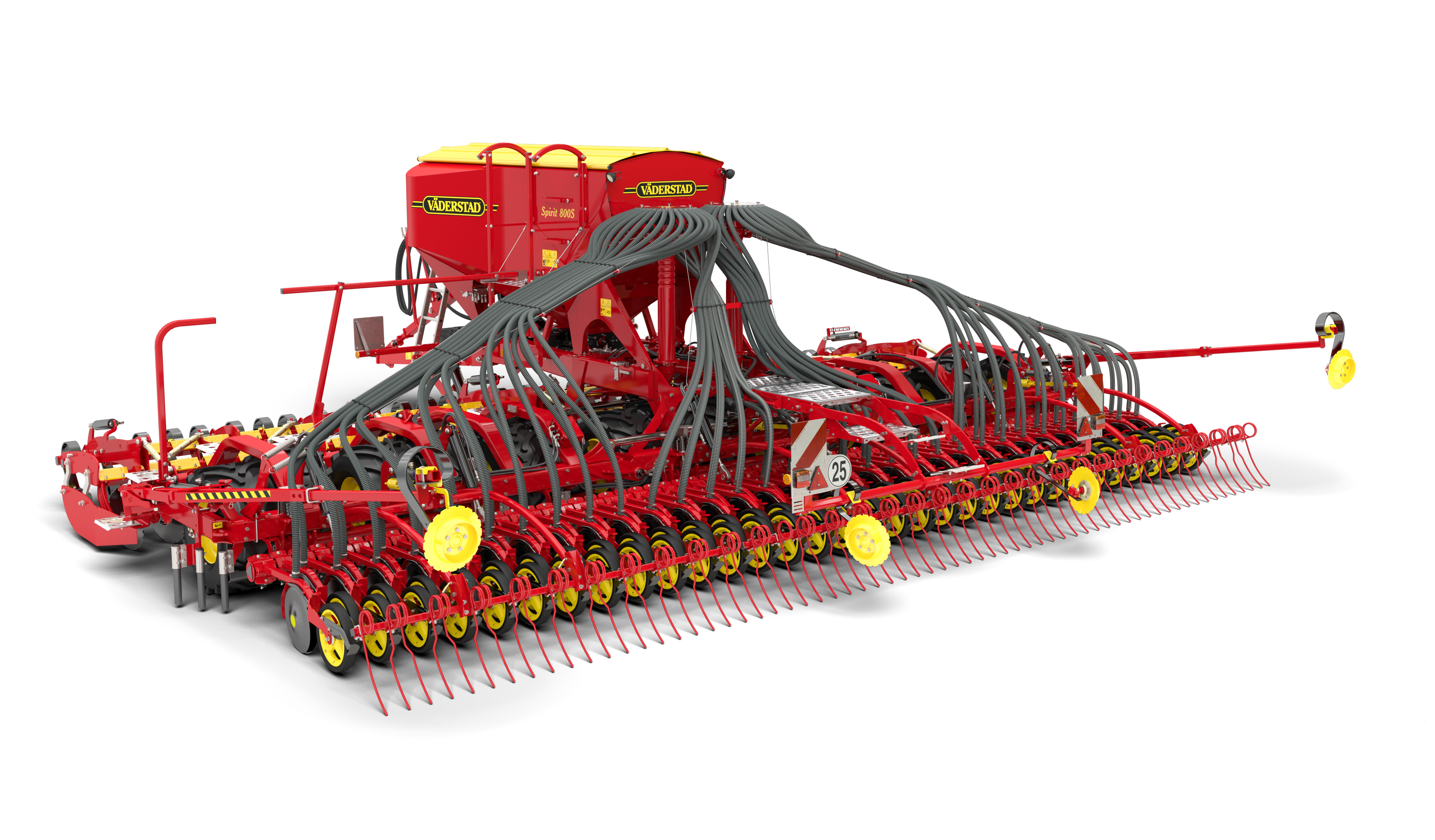 The Väderstad Spirit is a high-capacity seed drill for simultaneous seed and fertiliser application, available in working widths from approximately 4 m to 9 m.